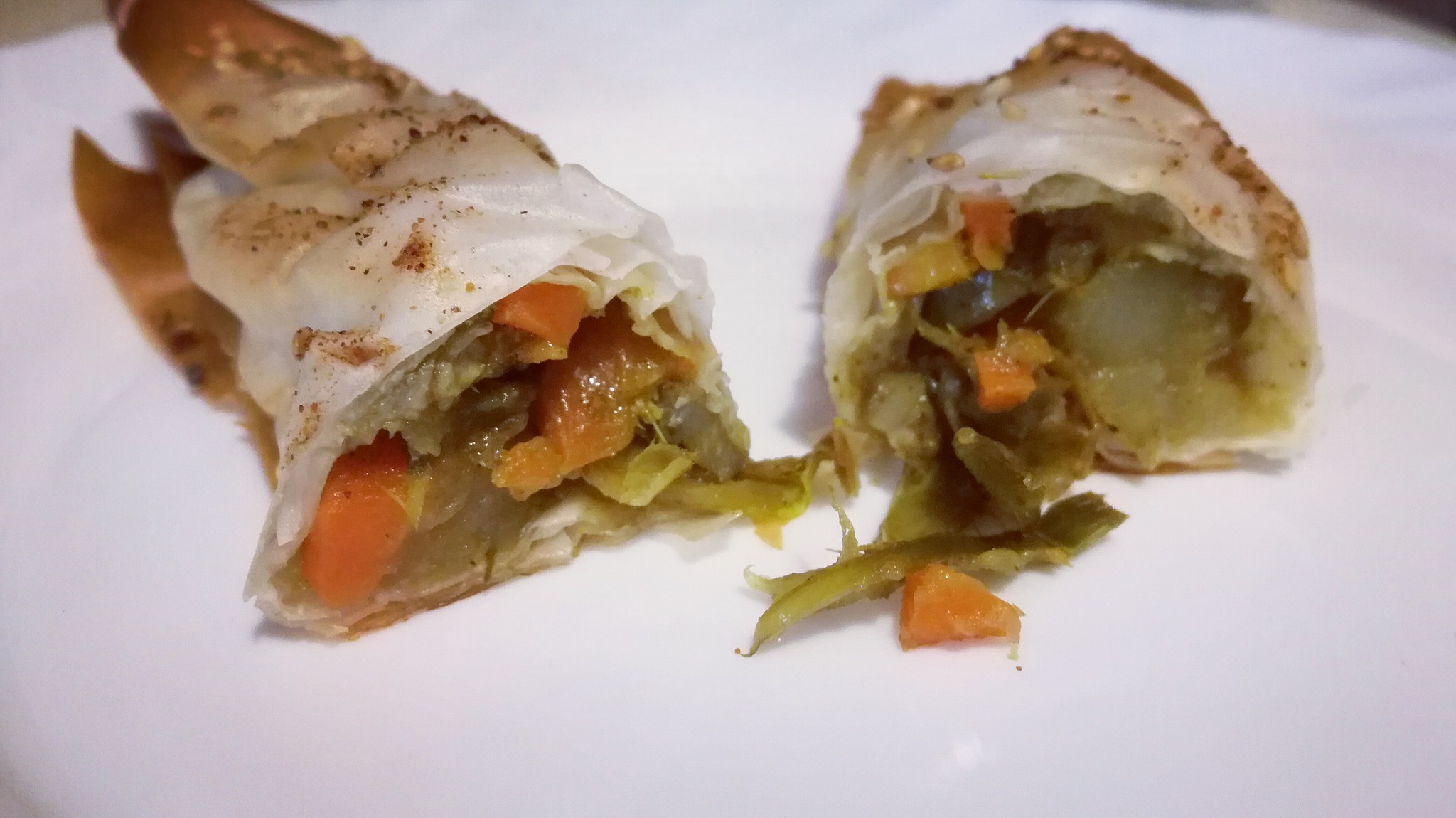 Fagottini di pasta fillo ripiene di verza, carote e patate con crema di tahina Fagottini di pasta fillo ripiene di verza, carote e patate con crema di tahina